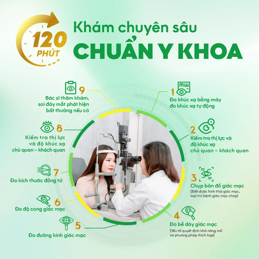 Để xác định chính xác độ khúc xạ của mắt; giác mạc đủ điều kiện phẫu thuật hay không và phù hợp phương pháp phẫu thuật nào, cũng như tiên lượng kết quả sau phẫu thuật, bạn cần trải qua bước kiểm tra chuyên sâu trước phẫu thuật với các bác sĩ chuyên khoa để được chẩn đoán và tư vấn tốt nhất.